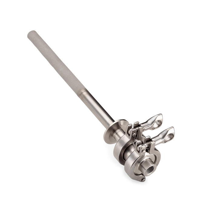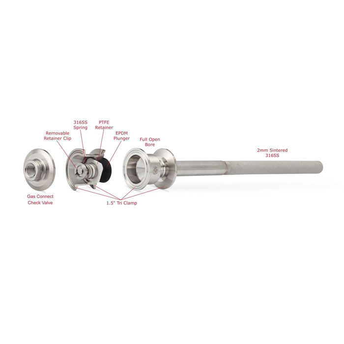 The 12″ stone includes 8″ of sintered 316L stainless steel and a solid 4″ collar to pass through thick glycol jackets and insulation. Connected externally via a 1.5″ Tri-Clamp flange, the check valve ensures safe gas flow while preventing backflow into your CO2 line. This assembly integrates seamlessly into your acid CIP loop to reduce beer stone buildup and keep your carbonation system performing at its best.